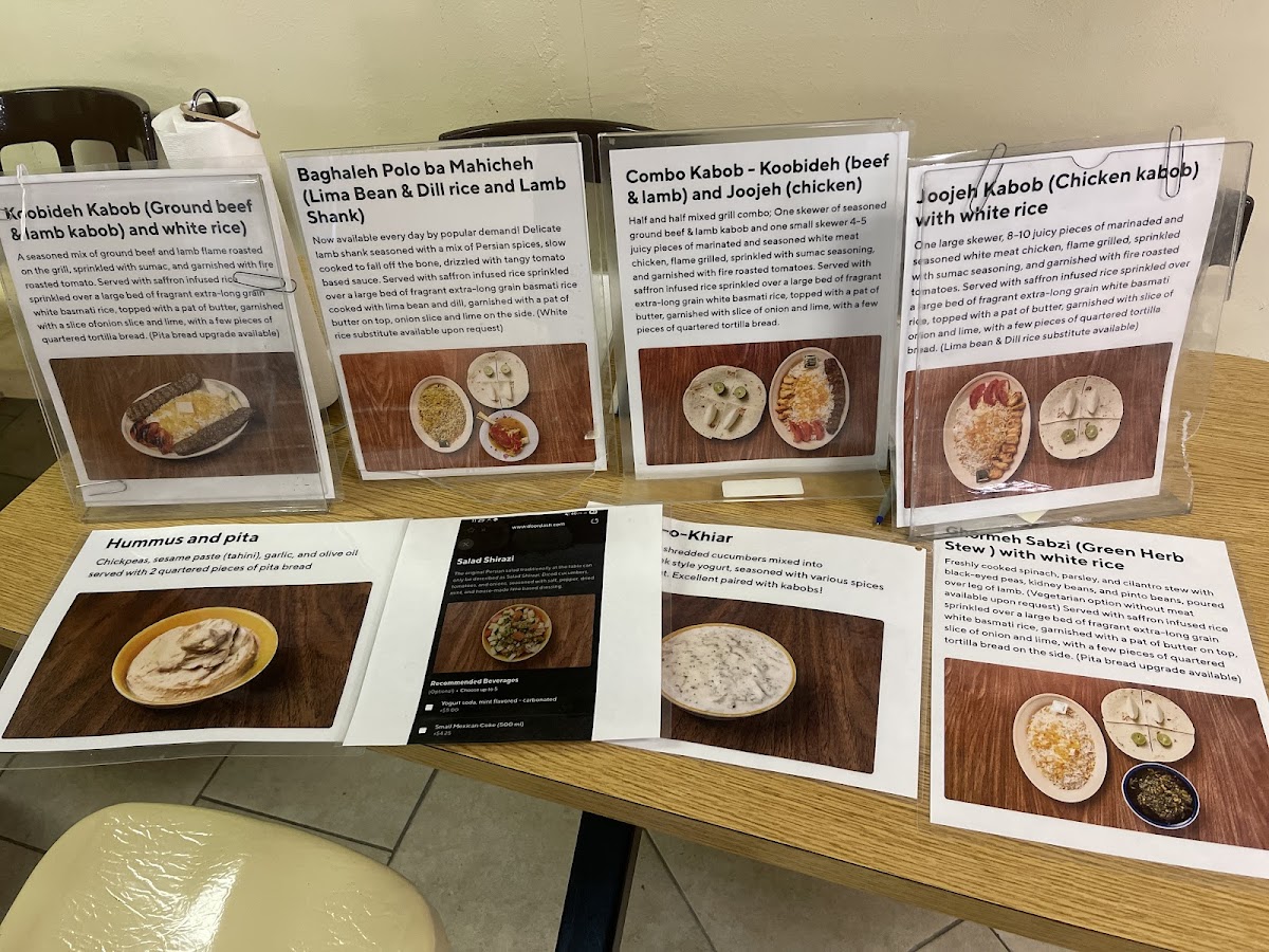 Guests can enjoy rich, slow-cooked specialties like Ghormeh Sabzi, a green herb stew served with fragrant white rice, or the satisfying Zarash Polo & Morgh, featuring chicken leg quarters alongside barberry and raisin basmati rice. Grilled kabobs, such as the seasoned Koobideh Kabob made with beef and lamb, offer a smoky, comforting option that complements the café’s simple yet cozy vibe.